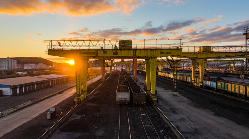 10月18日,在中国铁路哈尔滨局集团有限公司绥芬河站,机械化换装场在对入境货物进行换装作业(无人机照片)。