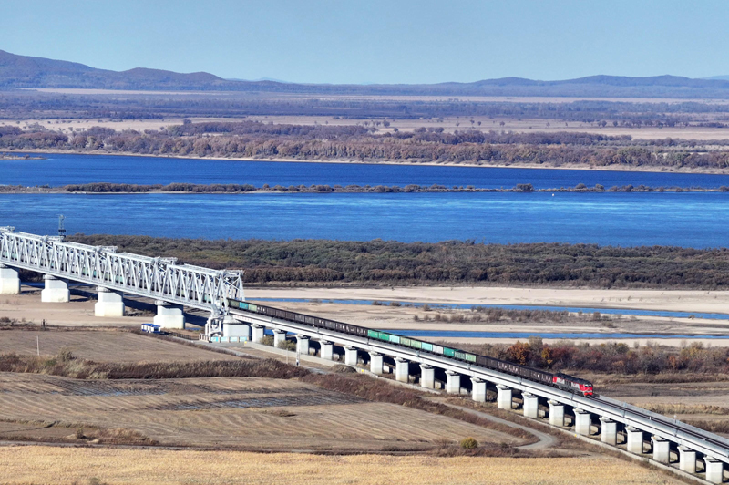 10月16日,满载进口物资的货物列车通过同江铁路大桥驶向中国铁路哈尔滨局集团有限公司同江北站(无人机照片)。