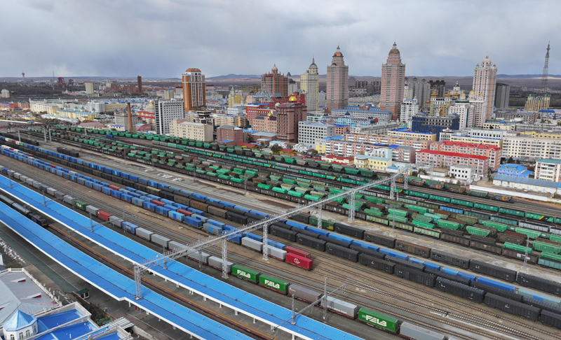 10月18日,在中国铁路哈尔滨局集团有限公司满洲里站编组场,中欧班列及进口货物列车在等待取送车作业(无人机照片)。