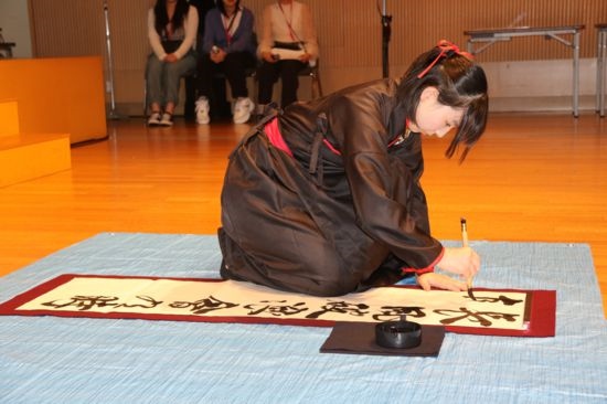 6月15日,在日本东京,选手在“汉语桥”世界中学生中文比赛日本赛区决赛中展示中文书法。记者 胡晓格 摄