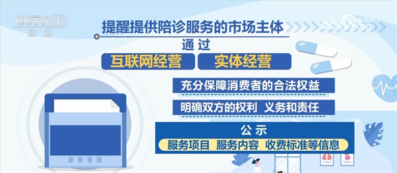 针对陪诊服务存在的一些问题,今年5月,北京市消费者协会发出提示,提醒提供陪诊服务的市场主体,无论是通过互联网经营,还是实体经营,一是要充分保障消费者的合法权益,明确双方的权利、义务和责任,公示服务项目、服务内容、收费标准等信息,二是要守法经营,诚信为本,不通过诱导等方式加价挂号、排队、取药,不做违反法律法规的行为。同时也提示广大消费者,要约定服务内容,明确双方责任,增强维权意识。