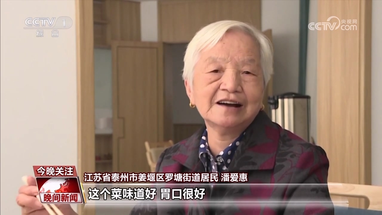 江苏省泰州市姜堰区罗塘街道居民 潘爱惠:这个饭也煮得很好吃,这个菜味道好,胃口很好。