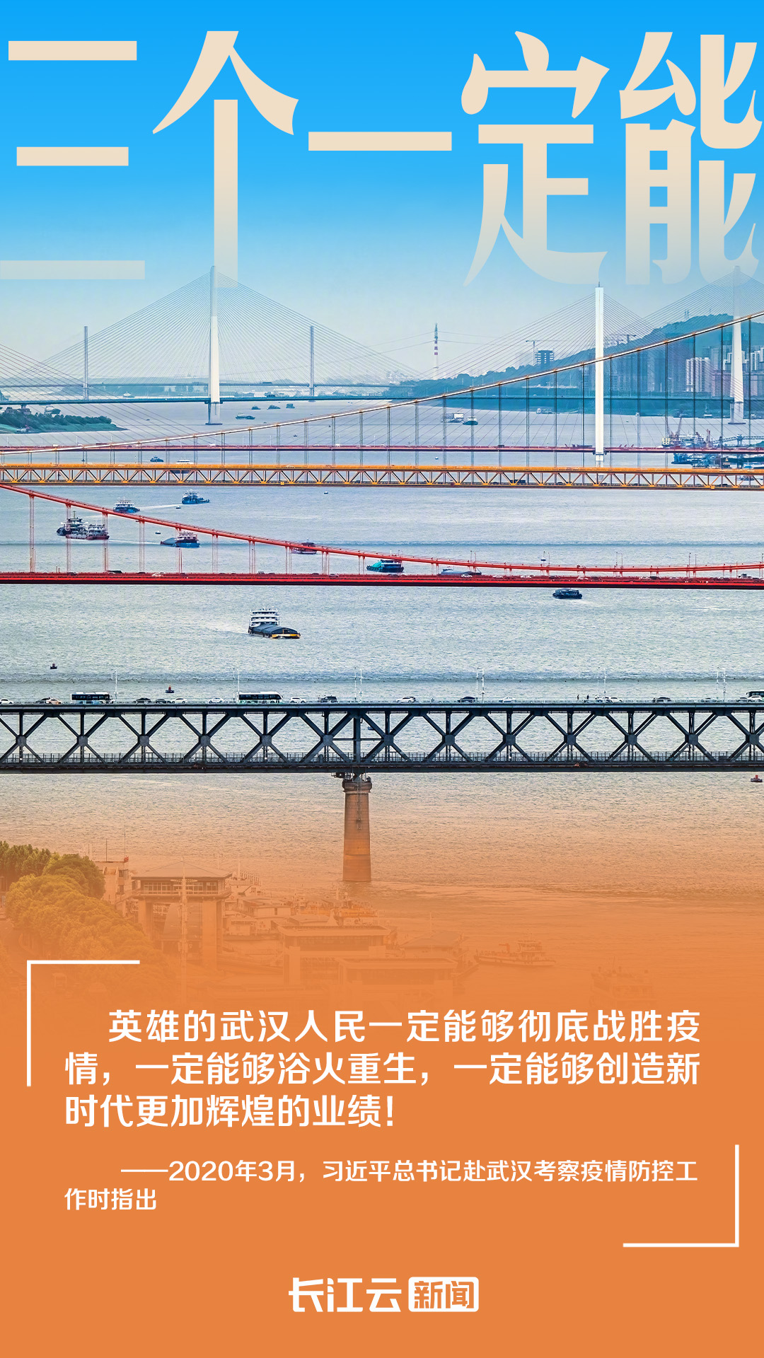 2020年3月,习近平总书记赴武汉考察疫情防控工作,“三个一定能”成为湖北顶压前行的信心和底气。