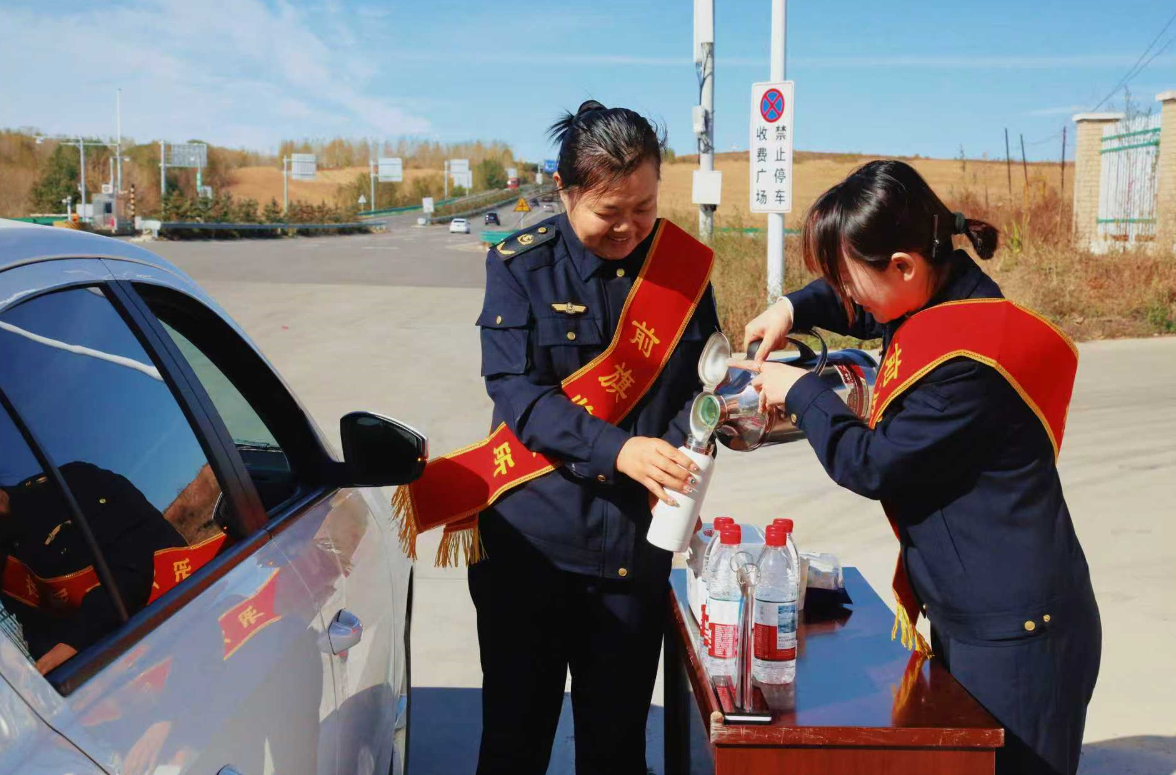 工作人员为过往司乘提供热水