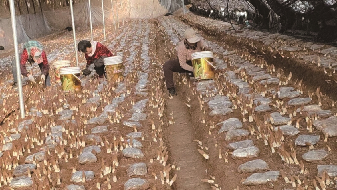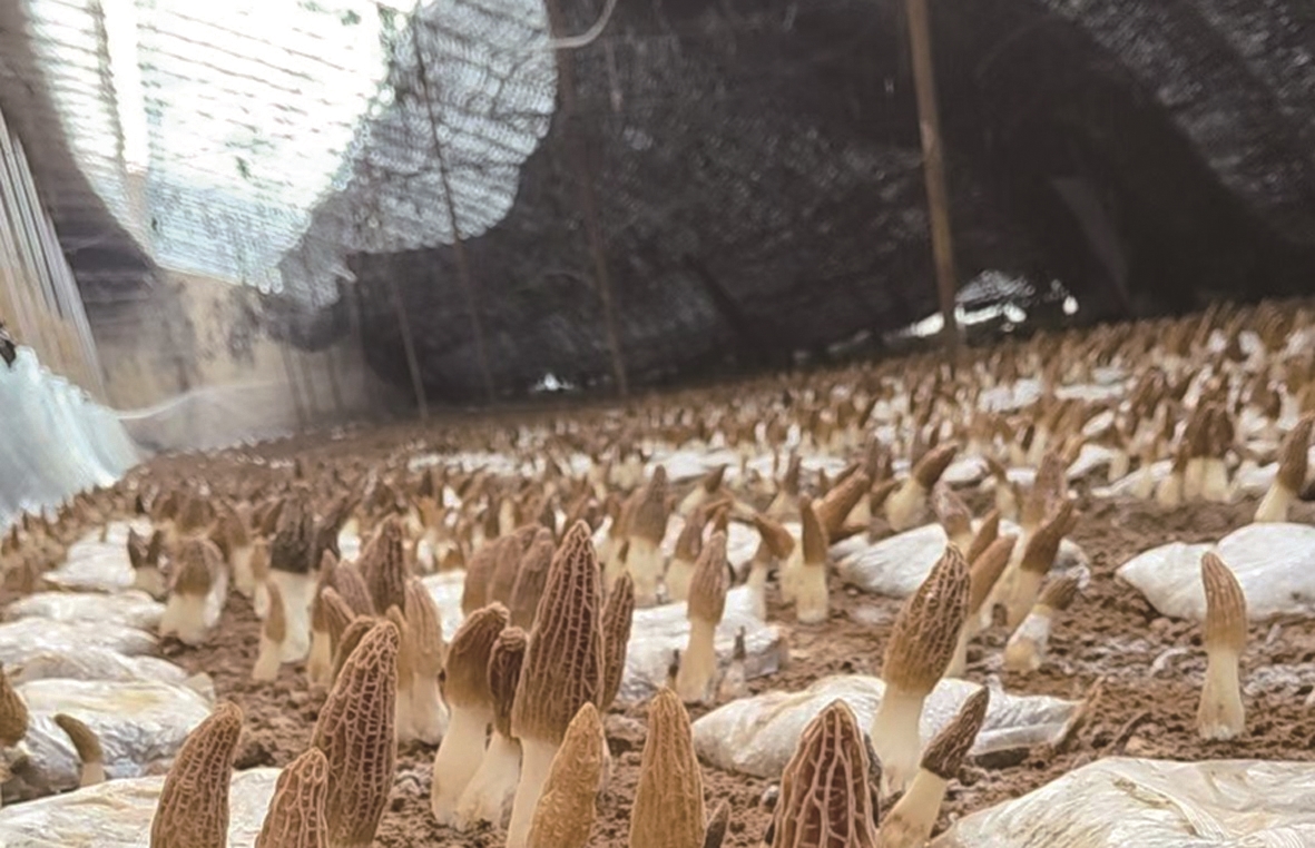 在赤峰市敖汉旗萨力巴乡设施农业产业园,暖意融融的大棚内菌香四溢,一朵朵羊肚菌撑着“小伞”破土而出,种植户和工人们穿梭在菌垄间熟练采摘,处处是丰收的喜人景象。 (王蒙)