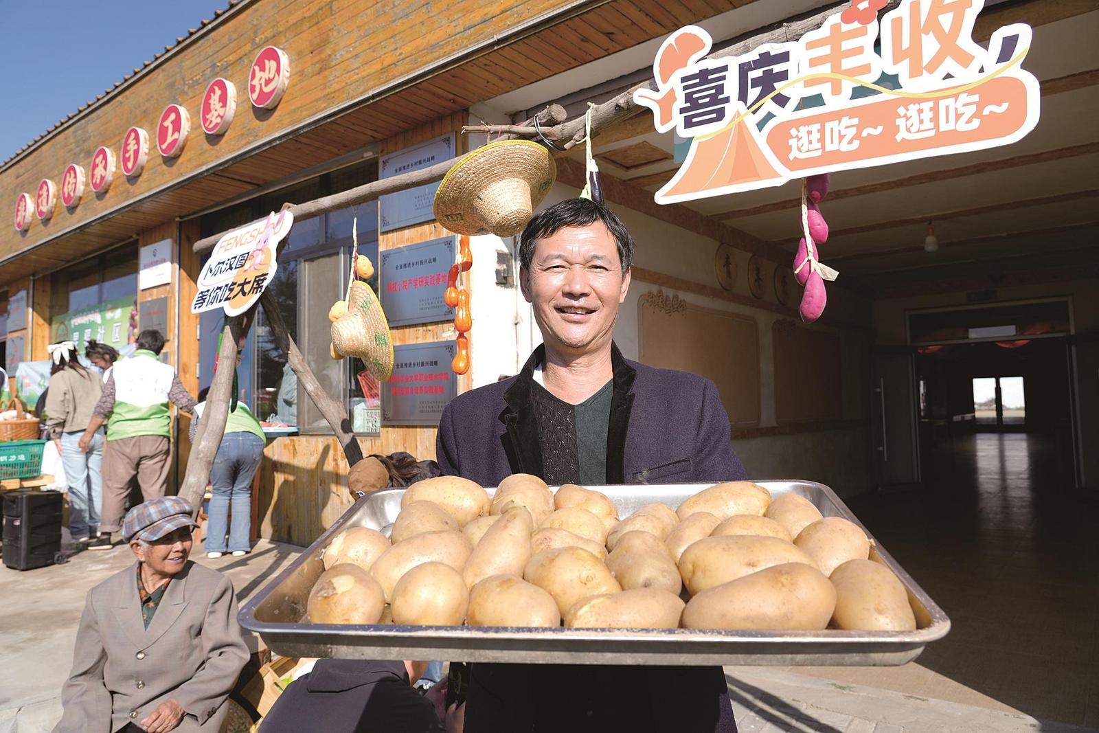 丰收节上,一村民端着自家种的土豆供人们免费品尝。