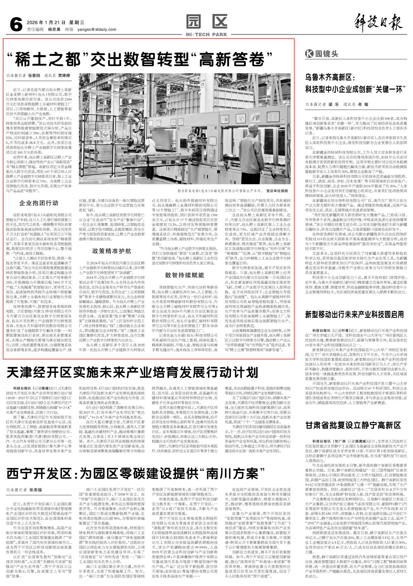2026年1月21日《科技日报》第6版刊发了《“稀土之都”交出数智转型“高新答卷”》的文章,报道了从政策精准滴灌到企业主动转型,从单个项目突破到全产业链升级,包头稀土高新区正以数字化转型为引擎,推动稀土产业从“世界级储量”向“世界级产业”稳步迈进,书写“稀土之都”数智转型的“高新答卷”。