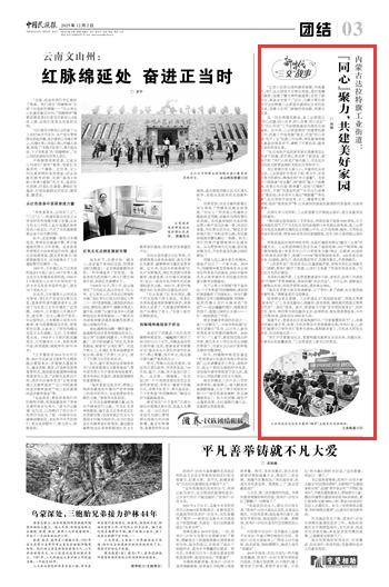 2025年12月2日,《中国民族报》第3版刊发题为《内蒙古达拉特旗工业街道:“同心”聚力,共建美好家园》的文章,报道了内蒙古达拉特旗工业街道以“同心共建、同心共学、同心共事、同心共乐”的“四心四共”工作法赋能基层治理。打造“同心向暖·花开工业”民族工作品牌,将民族团结融入基层治理各环节,奏响了开放包容、融荣共居的和谐乐章。