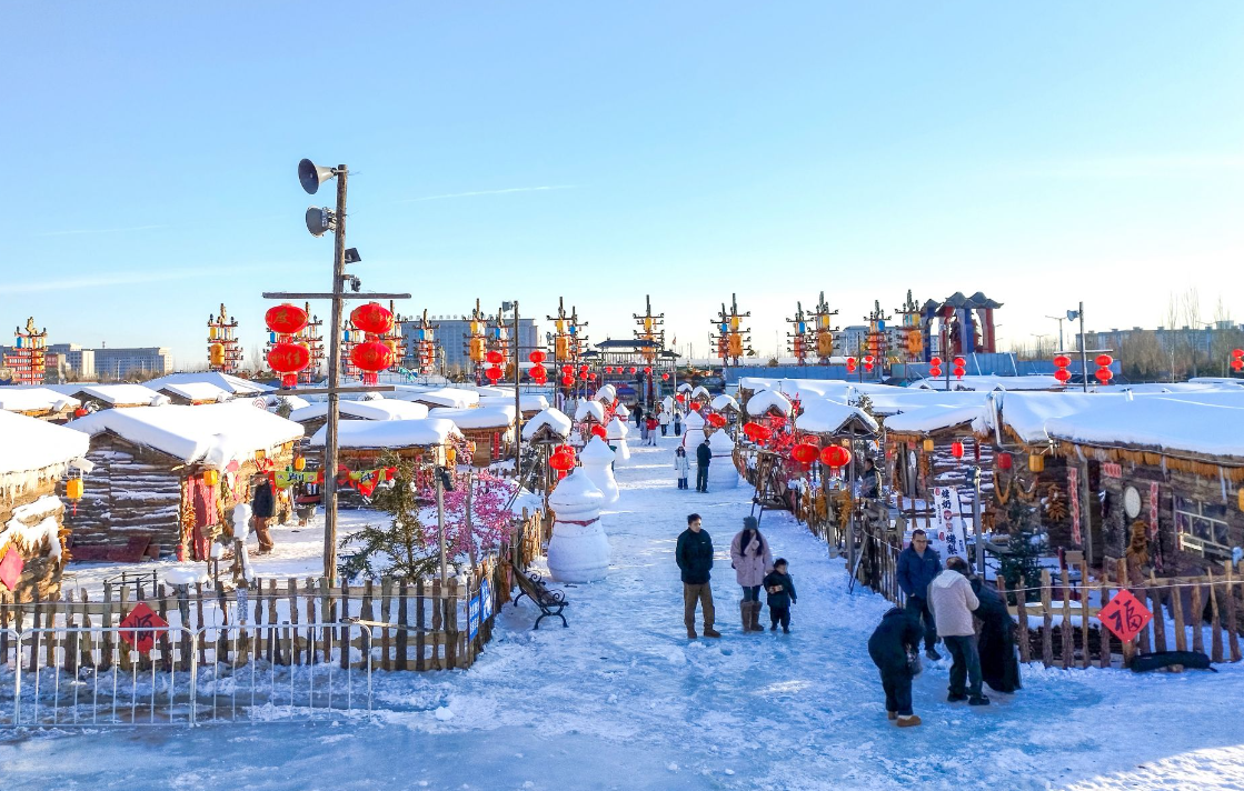 踏入雪乡板块,50个复刻北方传统风貌的院落集群映入眼帘,木栅栏上垂挂的红灯笼与蓬松雪层相映成趣,屋檐下悬垂的雪舌、雪帘勾勒出童话般的轮廓。每个院落都藏着专属打卡场景,推门而入可见家庭场景,窗外是皑皑白雪,屋内飘着烧烤、火锅和奶茶的醇厚香气,瞬间驱散冬日寒意。游客穿梭其间,铃铛轻响,为这份雪乡烟火气增添了浓郁的民族风情。