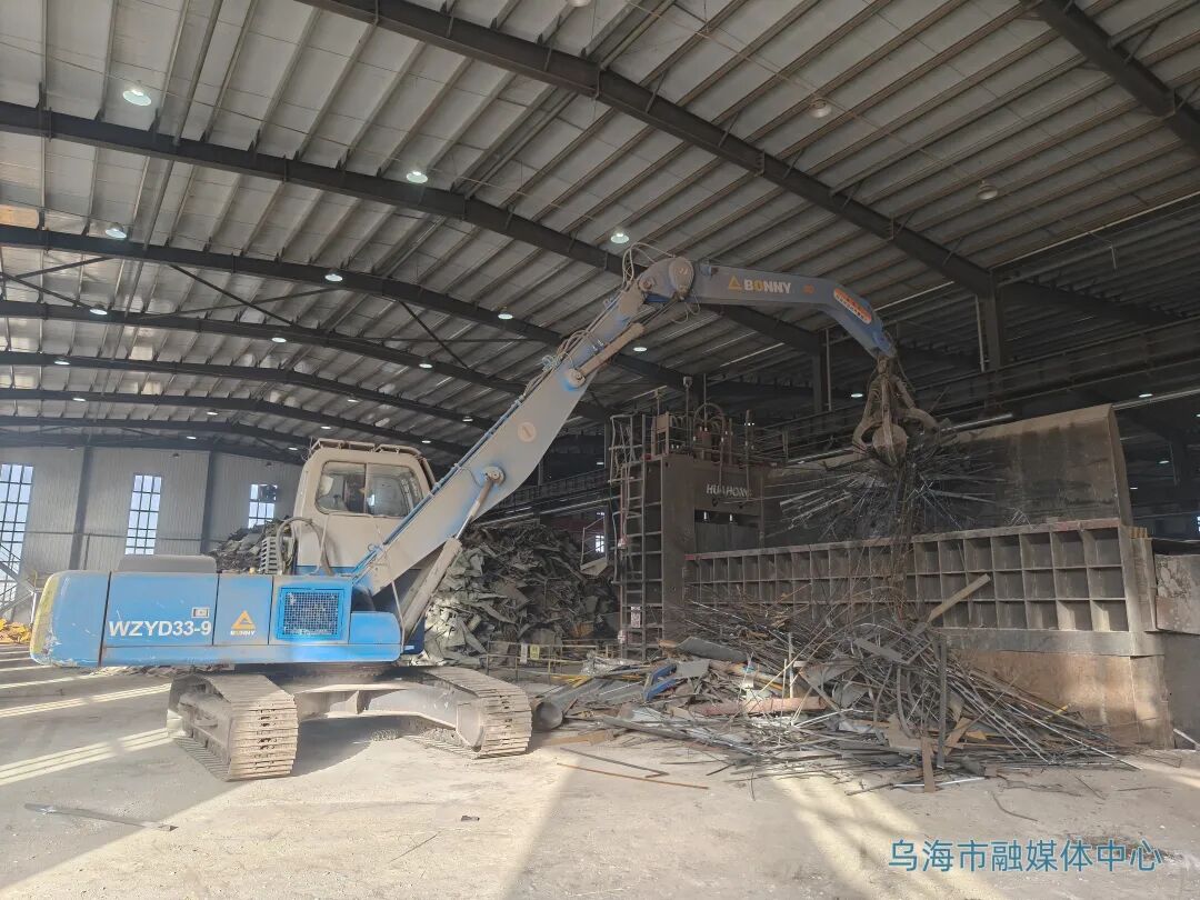 近日,记者来到位于乌海海勃湾高新技术产业开发区的内蒙古万斯通环保再生资源回收有限公司,走进废钢车间,龙门剪、抓钢机、电磁起重机等交叉作业,机械轰鸣声与金属撞击声、破碎声不绝于耳。