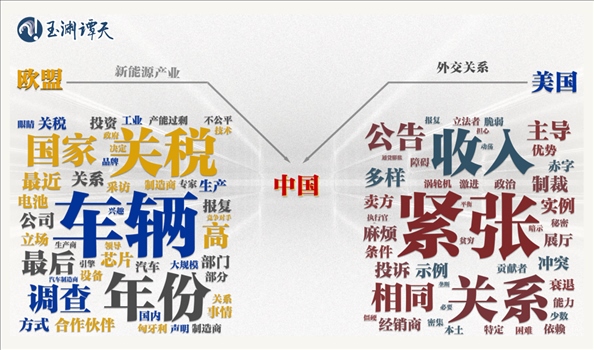 可以看到,以“车辆”“部门”“公司”“制造”等词为代表的关键词,都指向了新能源行业。相比之下,美国媒体对同一话题的讨论,更侧重“紧张”“关系”“冲突”“政治”等指向外交关系的关键词。