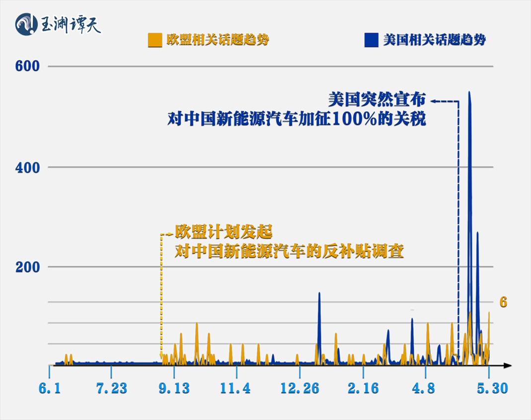 谭主分地区集纳了过去一年外媒关于“对中国新能源汽车加征关税”的报道,发现美国和欧洲地区出现了明显的错峰: