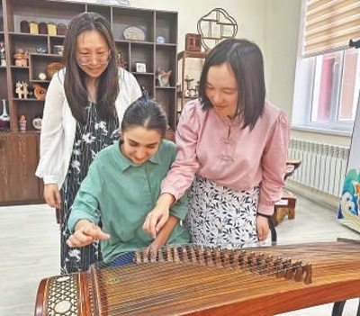 联合采访团队塔方记者在孔子学院体验古筝。本报记者 颜 欢摄