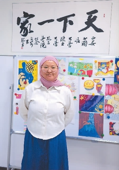 学生丽扎·穆罕默德在孔子学院书画墙前留影。本报记者 刘少华摄
