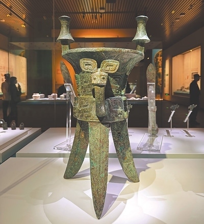 殷墟位于河南安阳市西北郊,是中国第一个有文献记载并经甲骨文及考古发掘所证实的商代晚期都城遗址,也是世界青铜文明的重要代表。殷墟博物馆与殷墟宗庙宫殿区隔河相望,是全景式展现商文明的国家重大考古专题博物馆。图为殷墟博物馆里展出的殷墟妇好墓出土的铜斝。人民网俄文专家 叶列娜·达维多娃摄 殷墟博物馆是一座历史文化的宝库。在这里,我近距离地观察一件件青铜器,仿佛看到其上闪烁着的中国古人智慧的火花;我端详一片片的甲骨,试图解读那些古老的文字,仿佛在与中国古人跨越时空对话。在这里,我看到了考古学家如何不遗余力地保护历史,也观察到年轻的甲骨文爱好者们不断用新鲜创意为文物保护注入新的生命力,这份传承让我深受触动。