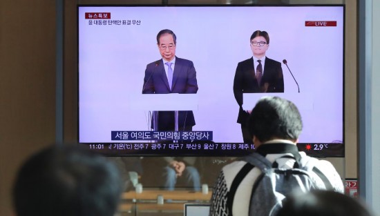 12月8日,在韩国首尔火车站,民众观看韩国执政党党首韩东勋与国务总理韩德洙(左)共同会见记者的电视直播。新华社记者 姚琪琳 摄