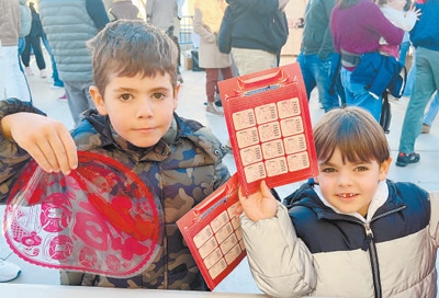 1月19日,在西班牙阿利坎特2025蛇年春节庙会上,小朋友们收集中国生肖印章并兑换新春福字窗花。
