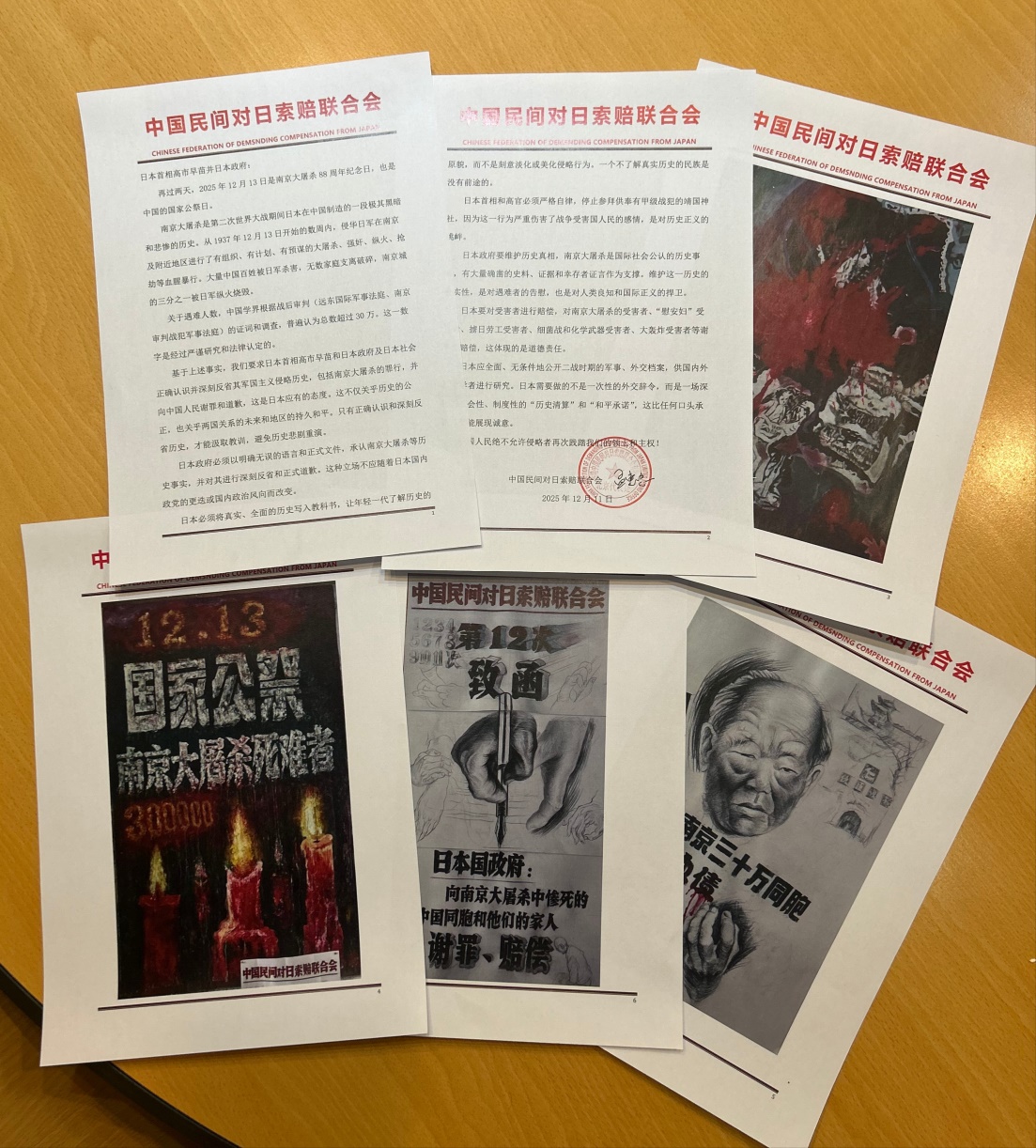 南京大屠杀88周年之际,中国民间对日索赔联合会通过日本驻华大使馆,致信日本政府及首相高市早苗,要求就南京大屠杀的罪行向中国人民谢罪并赔偿。