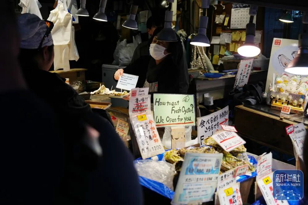 12月18日,在日本东京筑地站附近,一家海鲜店铺的店员向顾客推销。新华社记者 贾浩成 摄