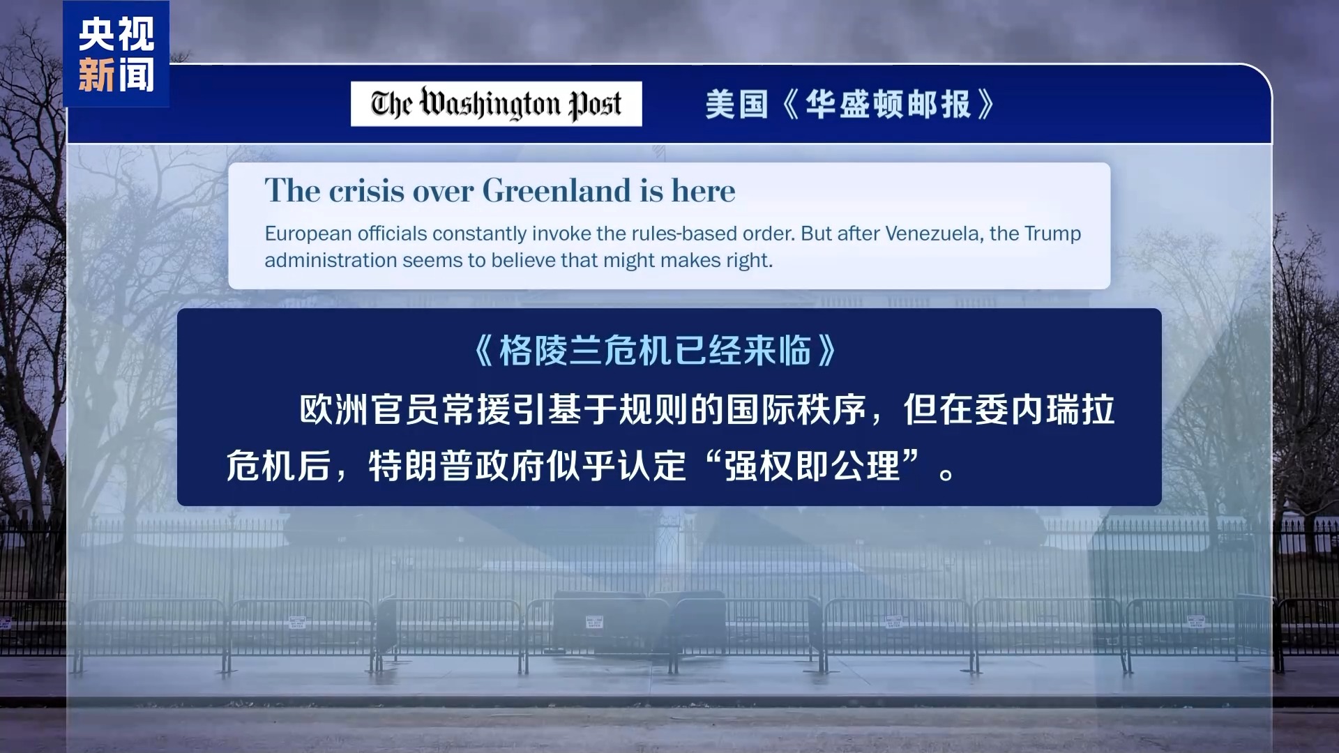 美国《华盛顿邮报》6日以《格陵兰危机已经来临》为题评论说,欧洲官员常援引基于规则的国际秩序,但在委内瑞拉危机后,特朗普政府似乎认定“强权即公理”。一年前,人们还把特朗普欲吞并格陵兰岛的话语当作其重返白宫后的又一次虚张声势,但现在,没人再把它当成笑话了。