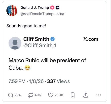 据报道,特朗普在其社交平台“真实社交”(Truth Social)上回应了一名用户早些时候发布的一则帖文,内容写道“鲁比奥将成为古巴总统”。特朗普转发时附上评论:“我觉得不错!”