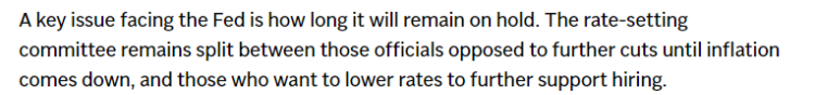 文章指出,美联储面临的一个关键问题是,基准利率不变会维持多久?实际上,利率制定委员会内部仍然存在分歧:一部分官员认为,通胀回落前不应继续降息;另一方则主张进一步降息,为就业市场提供更多支撑。