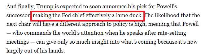 另外,文章称,预计白宫很快将宣布鲍威尔的继任者人选,届时鲍威尔实际上将成为“跛脚鸭”。(鲍威尔将于2026年5月结束美联储主席任期,但他的美联储理事任期要到2028年才结束。)文章分析认为,下一任美联储主席很可能采取不同的政策方针,这意味着鲍威尔对未来政策走向的预测能力变得有限,因为政策走向很大程度上已超出他的掌控。