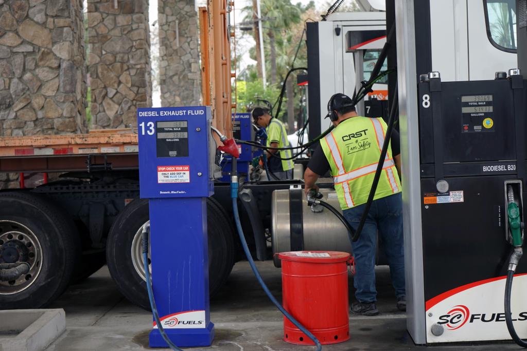 3月31日,在美国加利福尼亚州蒙罗维亚市的一座加油站,司机为卡车加油。新华社发(曾慧摄)
