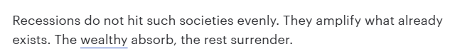 文章指出,经济衰退从来不会公平地影响整个社会。它只会加剧现有的社会分化:富人能够化解危机,而穷人只能举手投降。