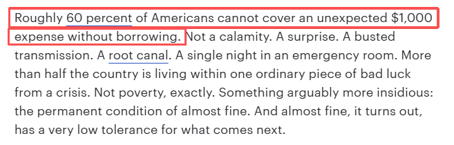 文章介绍,约60%的美国人若遭遇1000美元的意外开支,就不得不举债应对。不是天灾,只是寻常意外,比如变速箱损坏、牙齿根管治疗、急诊室留观一晚等等。美国超半数国民距离经济危机,只差一次厄运的降临。这算不上真正的贫困,却是一种更隐蔽的困境——永远在温饱线上挣扎。而现实证明,这种处境根本经不起任何风吹草动。
