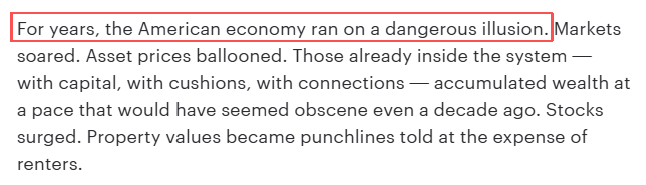 文章分析指出,美国经济多年来一直建立在危险的幻觉之上。市场呈现虚假繁荣,资产价格不断膨胀。那些掌握资本和人脉资源的既得利益者,正以惊人的速度积累财富。与此同时,普通民众却要面对生活成本的持续攀升:食品价格从缓慢上涨到快速飙升,房租成为每月必须面对的生存考验,信用卡从救急工具变成了新的债务陷阱。美国中产阶级正面临前所未有的生存压力,阶层滑落的风险远大于上升机会。