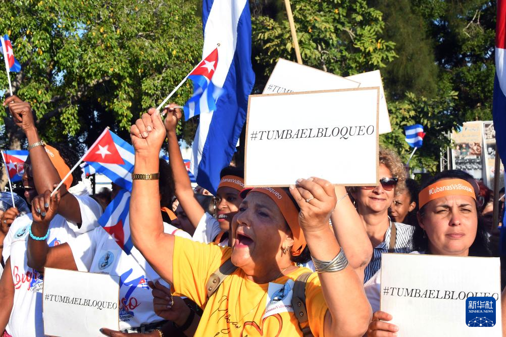 本次集会由古巴妇女联合会发起。现场民众聚集在公园中央,挥舞古巴国旗,高举写有“推翻封锁”的标语。古巴国家副主席萨尔瓦多·梅萨以及其他古巴党政机关和群众组织代表出席活动。