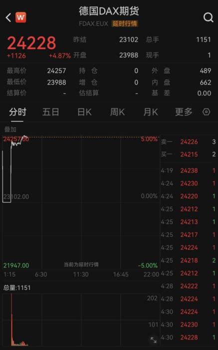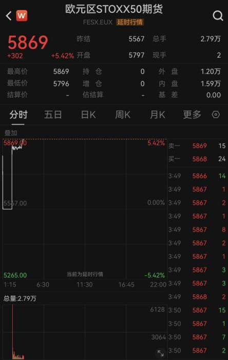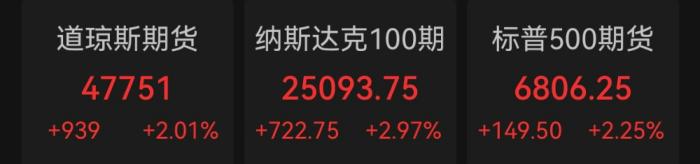 欧美市场期货同步上涨,欧元区斯托克50指数期货上涨超5.5%,德国DAX期货最高涨超5%。美股三大指数期货均涨超2%,其中纳斯达克100期货小型最多涨超3%。
