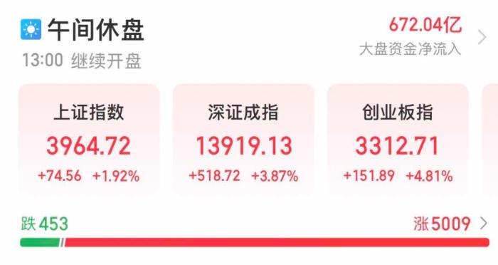 受投资者情绪提振,亚洲股市今早开盘后同步暴涨。午间休盘,A股三大股指仍全部上涨,上证指数最高涨近2%,深证成指最高涨幅达3.87%,创业板指数涨4.81%。午间休盘前,股市中仍有超5000只个股上涨。