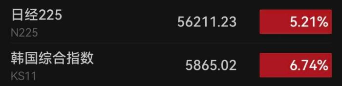 截至8日13:00,日经225指数盘中涨幅超5%,最高报56304.49点。韩国综合指数一度涨幅超7%,最高报5882.91点,且仍在持续走高中。据韩联社报道,韩国综合股价指数(KOSPI)和创业板指数(KOSDAQ)开盘后双双大涨,一度同时触发暂停程序化交易的“临时停牌”(Sidecar)机制。