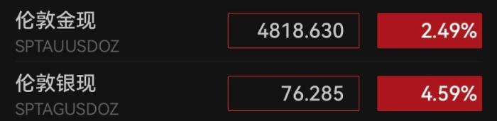 国际贵金属市场并未因停火消息而降温,反而显著走高。截至8日13:00,伦敦金现盘中大涨超过3%,再度涨超4850美元/盎司;国际银价大涨,伦敦银现盘中涨幅近6%,突破77美元/盎司。