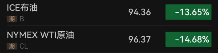 伴随股市大涨,国际油价、贵金属价格也出现大幅波动。国际市场原油价格“高台跳水”,截至8日13:00,WTI原油期货盘中一度跌幅超过19%,跌破每桶100美元关口,达91.05美元/桶。布伦特原油期货一度跌超16%,达最低91.7美元/桶。