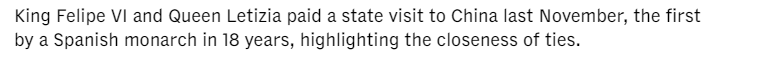 西班牙首相桑切斯4月11日至15日对中国进行正式访问。此访是桑切斯四年内第四次访华。多家外媒都予以关注和报道。亚洲新闻台的报道说,去年11月,西班牙国王费利佩六世对中国进行了国事访问,这是西班牙国王时隔18年再次访华,凸显了两国关系的密切性。