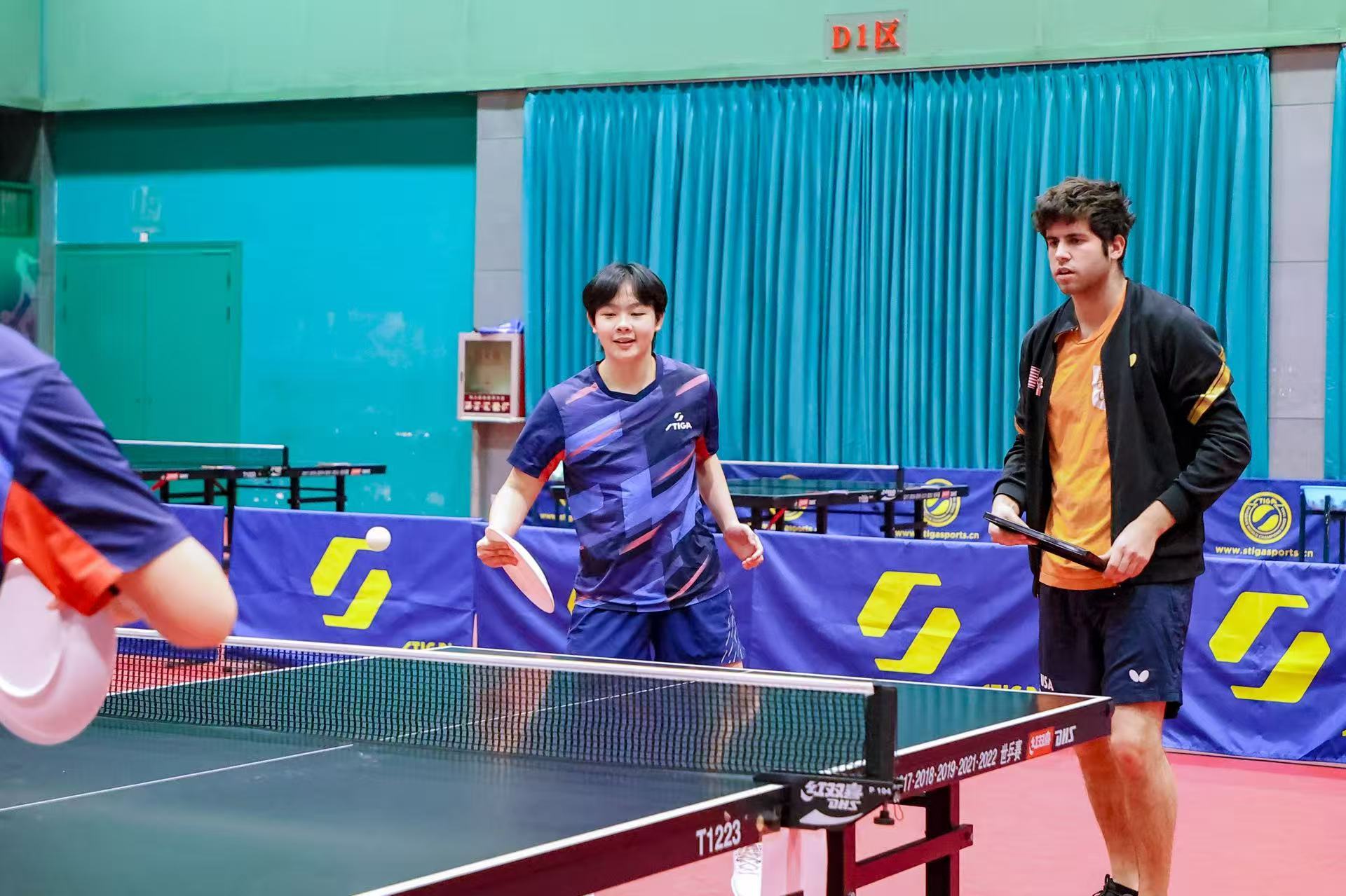 美国乒协注册运动员凯・扎雷宾在正定国家乒乓球训练基地与中国青少年球员开展友谊赛