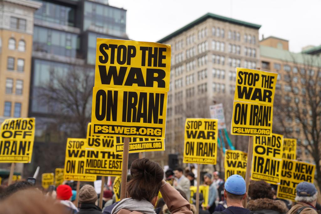 2026年3月7日,人们在美国纽约参加集会游行,抗议美国和以色列对伊朗发动军事打击。新华社记者张凤国摄