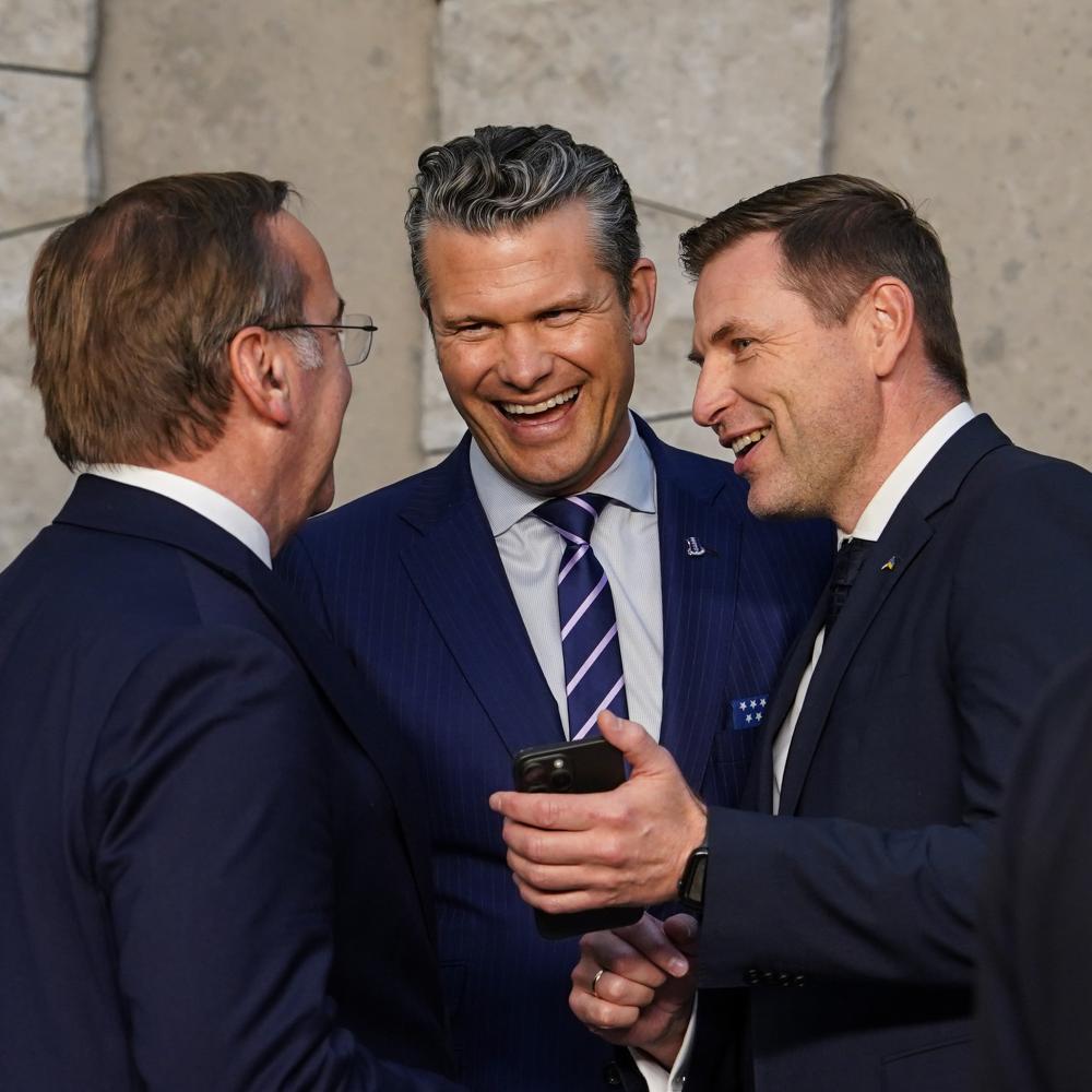 2025年10月15日,在比利时布鲁塞尔举行的北约防长会议结束后,美国国防部长赫格塞思(中)与爱沙尼亚国防部长佩夫库尔(右)、德国国防部长皮斯托里乌斯交谈。新华社记者彭子洋摄