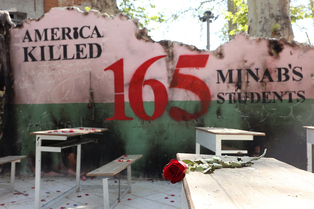 △伊朗德黑兰北部,一朵花被放置在象征米纳卜学校的纪念处(资料图)