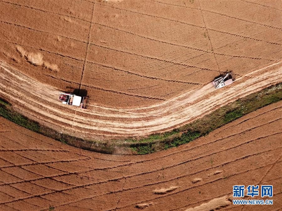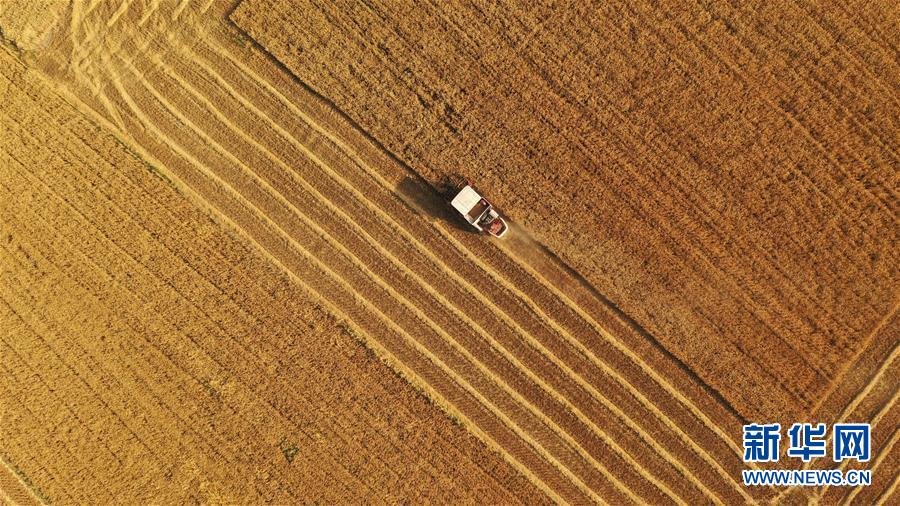 6月2日,在江苏省淮安市洪泽区,农民驾驶农机收割小麦(无人机照片)。 “三夏”时节,麦浪滚滚。农民在田间加紧抢收,确保小麦颗粒归仓。新华社发(陈凯摄)
