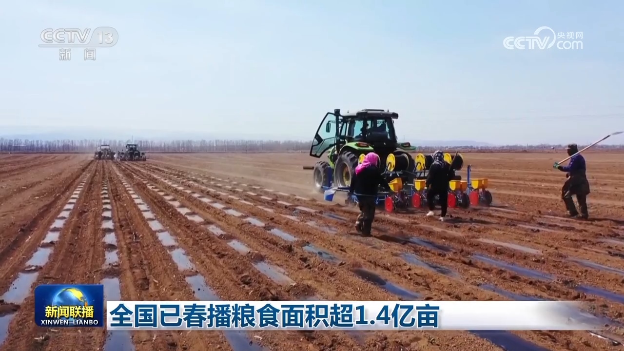 央视网消息(新闻联播):农业农村部最新农情调度显示,截至目前,全国已春播粮食面积超1.4亿亩,各地多措并举,高质量推进春季农业生产。