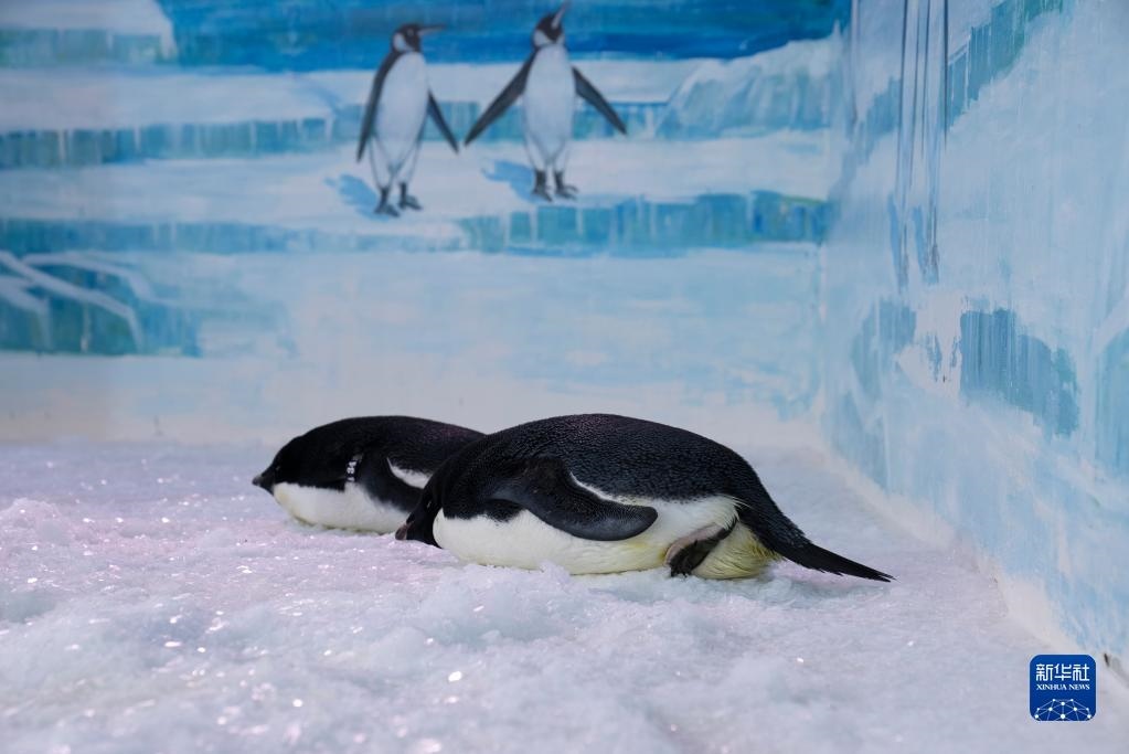 4月28日凌晨,在哈尔滨极地公园,新引进的阿德利企鹅在适应“新家”。