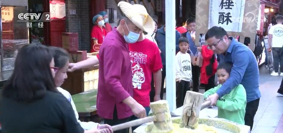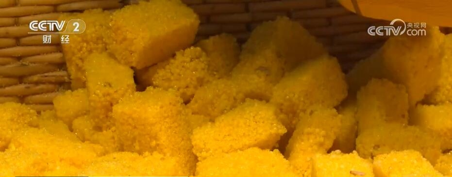 在这条街区,你还可以找到各种陕西特色美食的身影。这种色泽金黄的美食叫陕北小米酥,现场制作,入口酥脆。这个“五一”假期,很多游客一路逛一路吃,走的时候还会给家里人带上几盒。