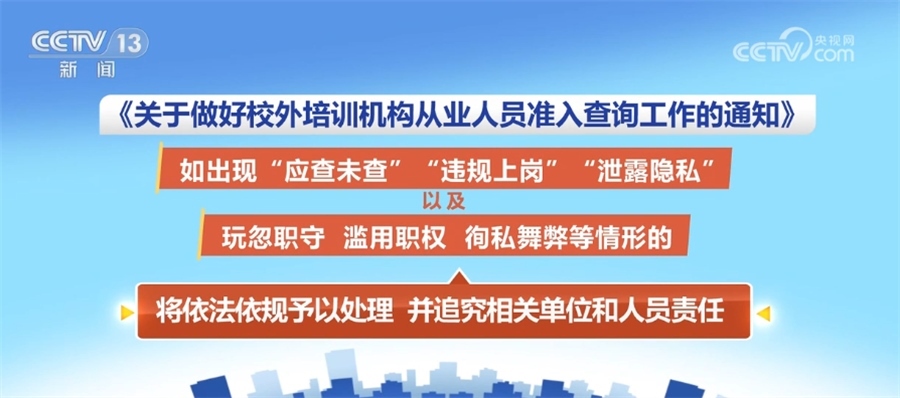 此外,《通知》强调严明查询管理责任。各级教育部门和相关主管部门、校外培训机构及其工作人员应履行准入查询的法定职责,如出现“应查未查”“违规上岗”“泄露隐私”以及玩忽职守、滥用职权、徇私舞弊等情形的,将依法依规予以处理,并追究相关单位和人员责任。