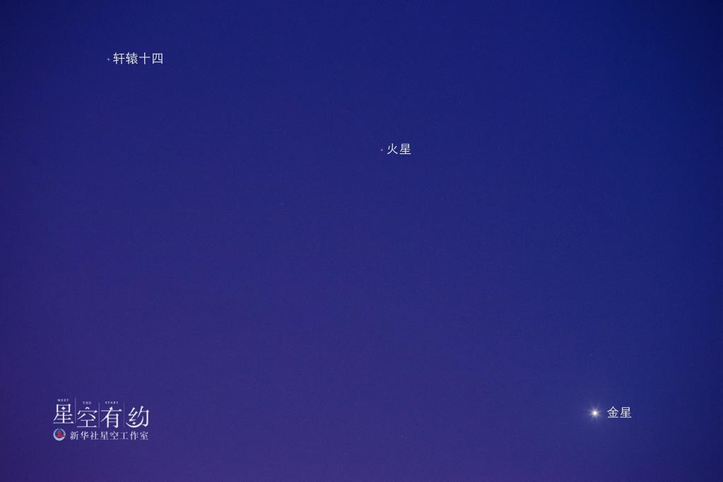 本次相合,火星与轩辕十四最近时仅有0.7度,就比一个满月视直径(约为0.5度)大一点,不过受日光影响,无法看到它们相距最近时的情景。好在当天20时左右,两星近距离争辉的场景在渐黑的暮色中依然会呈现,感兴趣的公众可以尝试观测。