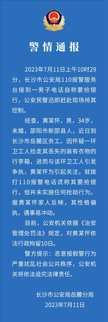 ·一人因与环卫工人引发争执,为引起关注,拨打110报警电话谎称要抢银行。长沙警方通报,对其依法行政拘留10日。