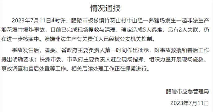·11日,湖南醴陵发生一起非法生产烟花爆竹爆炸事故,造成5人遇难,2人失联,涉嫌非法生产有关责任人已被公安机关控制,案件仍在进一步核实中。